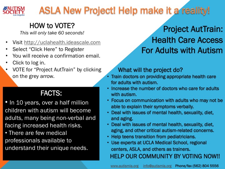 Our most exciting new initiative needs your help to make it a reality. Help by VOTING for Project AutTrain: Health Care Access for Adults with Autism – VOTE HERE (details attached below).