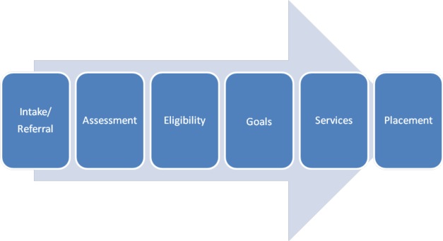 The specialist would start with testing or assessment. Assessment gets to the bottom of what is going on and defines what you need. After testing, the specialist may confirm a diagnosis and tell you that you need some type of treatment. This is like the stage of eligibility: it is confirmed that your condition qualifies you to receive services/treatment.
